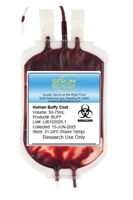 Derived from 500 mL of peripheral blood, buffy coats are manufactured by centrifuging blood at a low speed to remove platelet rich plasma and red blood cells. The remaining buffy coat layer is enriched for leukocytes/white blood cells, while still containing trace amounts of red cells and other blood components.